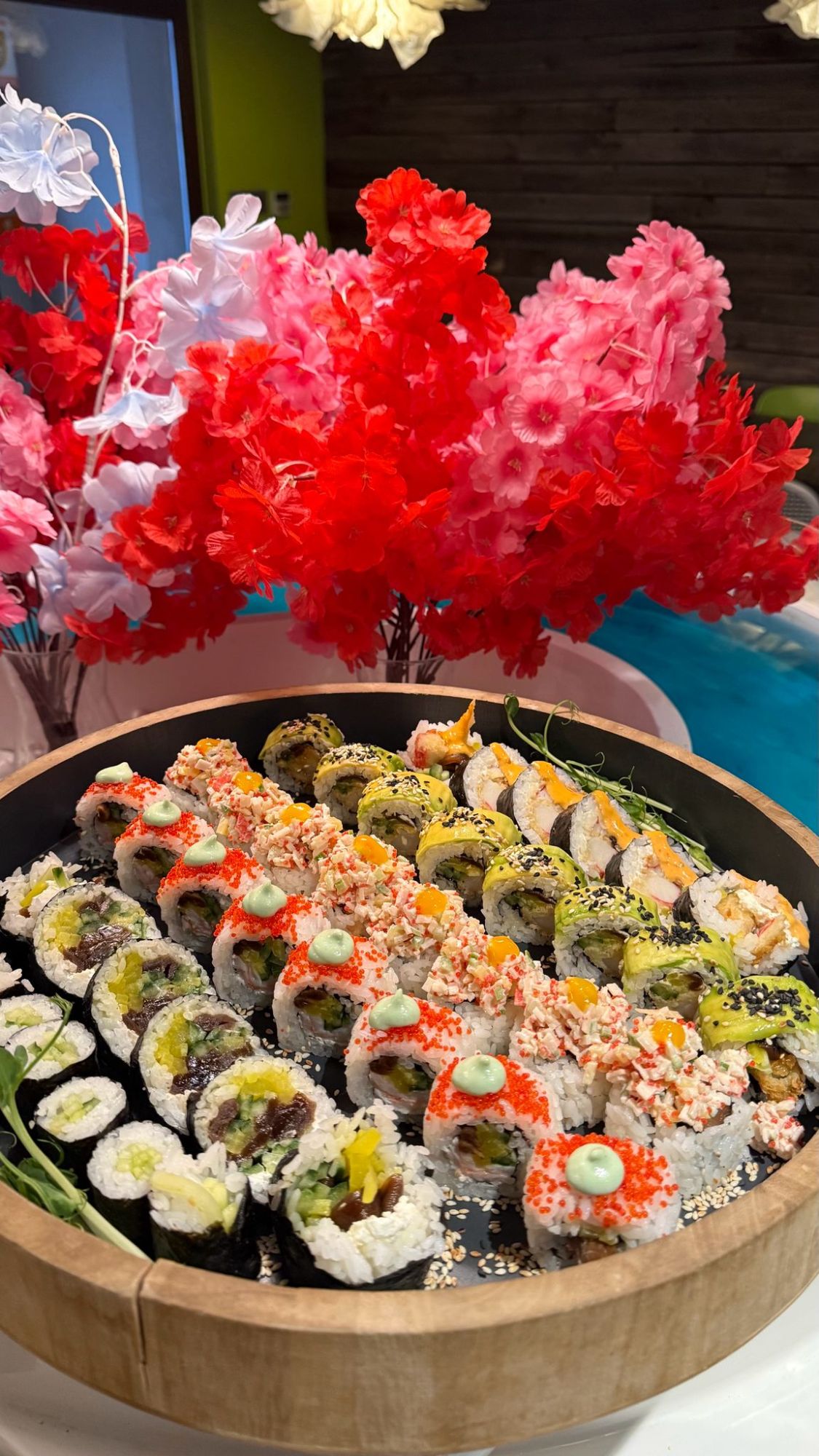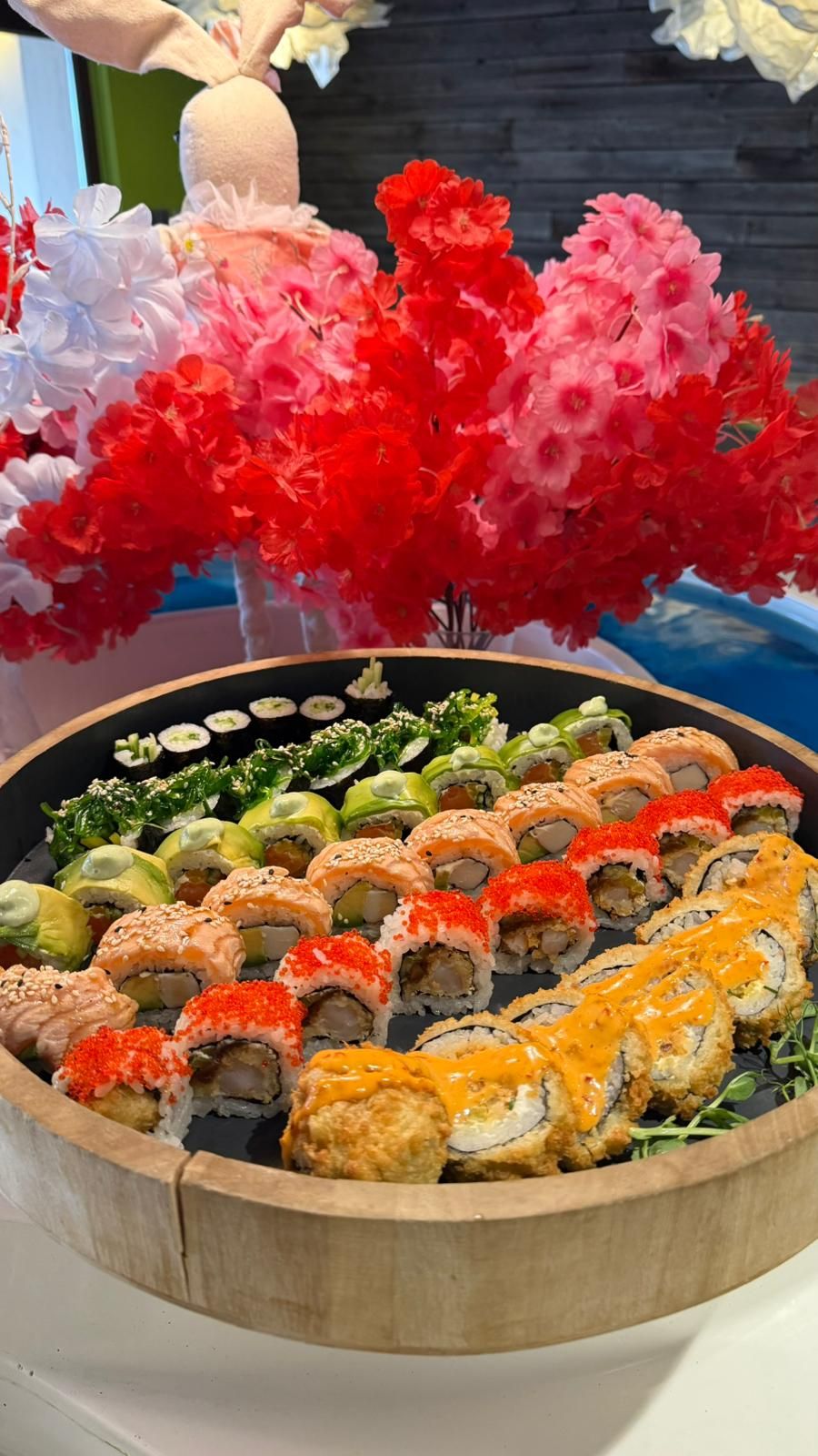 - 8szt. uramaki z łososiem, serkiem philadelphia, awokado, na wierzchu z pikantnym sosem spicy mayo, szczypiorem
